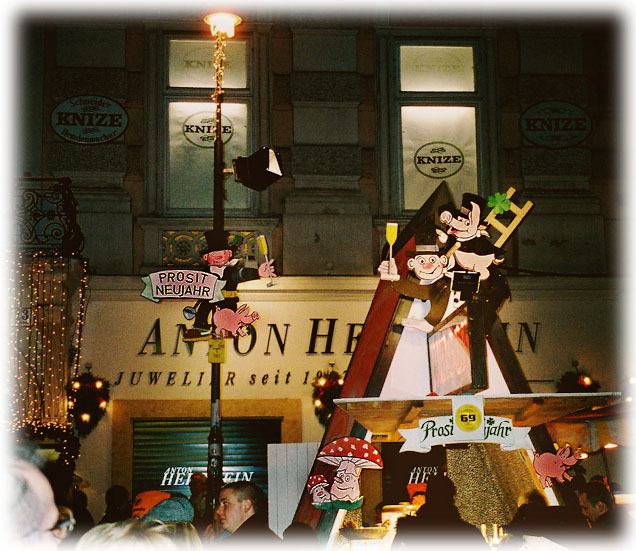クリスマスから新年にかけて、ウィーンのあちこちに出没する最強の三人組。雪の中から、やがてやって来る幸運の春を約束するラッキートリオ。いづれも、ヨーロッパではよく知られた縁起物、頼もしい煙突掃除のおじさんと、ピンクのブタが、水玉模様のキノコのもとでチームを組みました。サンタクロースのソリが去って、彼らが活躍しはじめると、オーストリアもいよいよ年越し気分だそうです。Prosit Neujahr=プロージット・ノイヤール!(新年おめでとう)の声に乗せて、また新しい幸福をばらまいてくれるでしょう。高さ12cm、グローブ直径80mm。