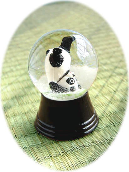 雪の中のパンダ、立ったり転んだり。粘土をこねたまんまのようなすがたが愛らしい です。机の上に一日中、こうしてグローブの中で遊びながら、うちのひとが戻るのを 待っててくれる事でしょう。帰って来たら、思いきり振って粉雪を盛大に上げて、雪遊びさせてやって下さいね。高さ7cm、グローブ直径45mmです。 1つのみのお値段です。